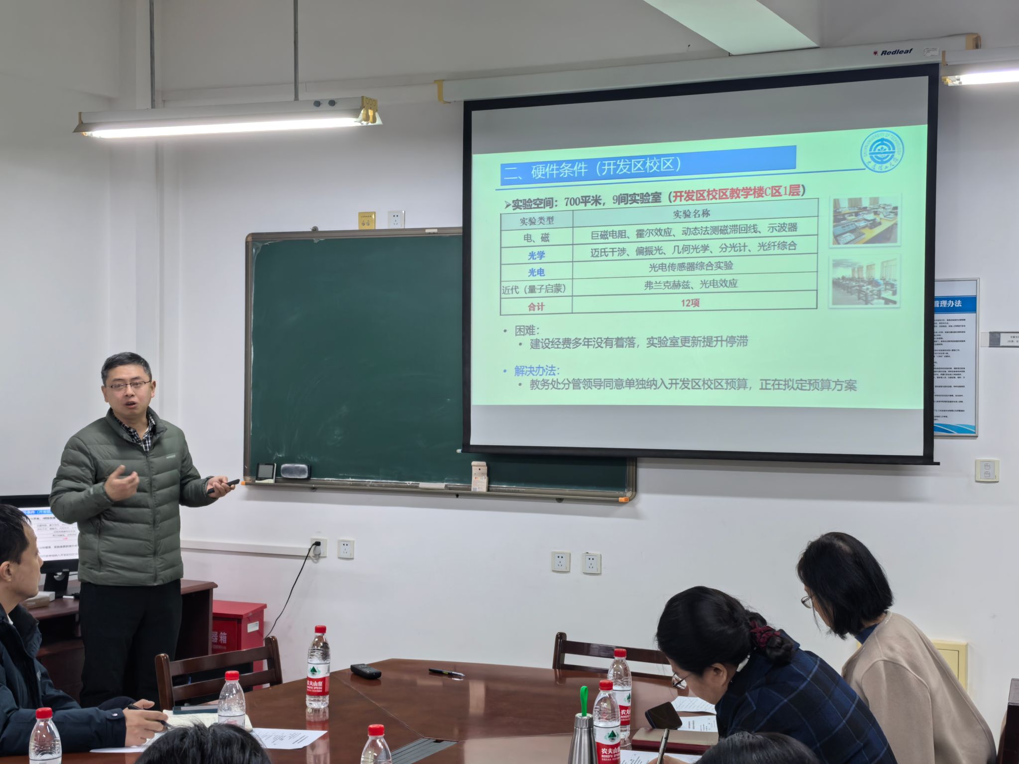 李建东对实验中心历史沿革、教学条件情况、教学团队及工作量情况、近代物理实验课程基本情况进行了介绍。王淑芬对大学物理实验课程基本情况、开设实验项目、教学设计思路、课程创新特色进行了介绍。吴兴伟对全国大学生物理实验竞赛的参赛和培训情况进行了介绍。白洪亮对开发区校区物理实验教学工作、信息化建设、创新实践基地与物理学术竞赛的基本情况进行了介绍。