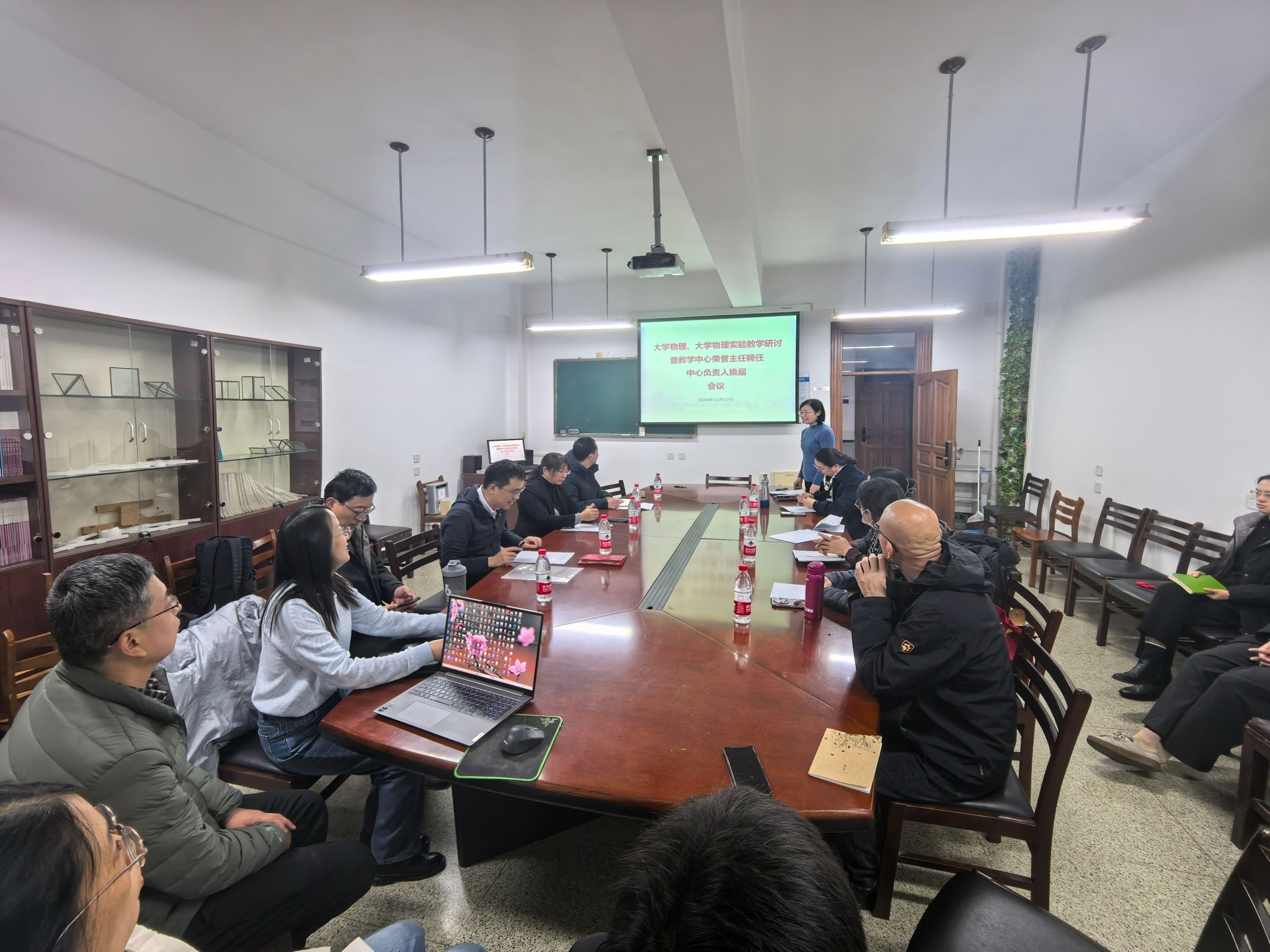 会议由大学物理教学中心主任李淑凤教授主持。物理学院院长、国家杰出青年基金获得者王正汹教授,物理学院副院长韩永昌教授,物理与光电实验教学中心主任王晓娜教授级高级工程师,大学物理教学中心原主任李雪春教授,大学物理教学中心全体教师参加会议。