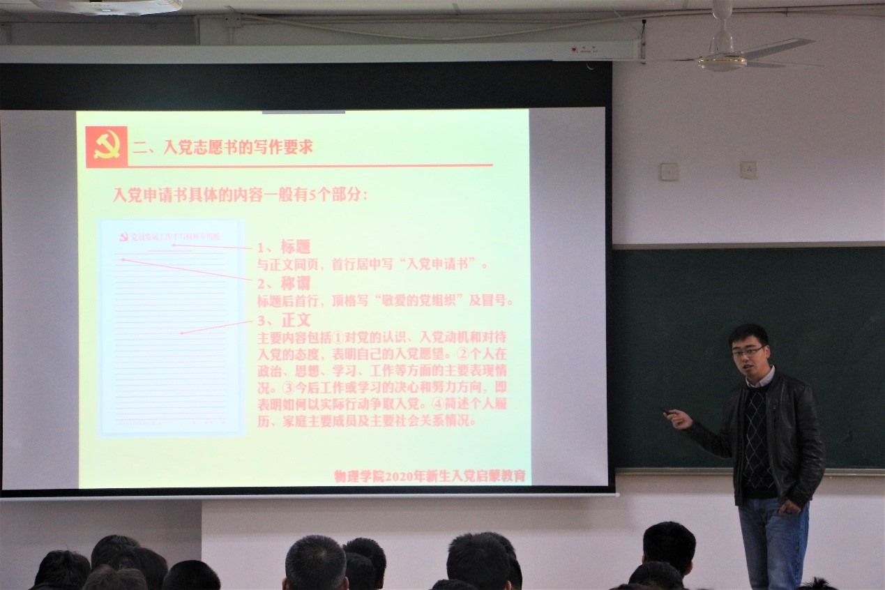 2020年11月4日物理学院在综合2号楼B306举行新生入党启蒙教育。学院党委书记王正汹,以及学院党委组织员佟西原在这次会议中位20级学生进行入党启蒙。王正汹书记向新生介绍党的基本知识、党的光辉历程、大学生的责任与使命和怎么做才能加入中国共产党。接着由佟西原老师向新生介绍了申请入党的基本流程与规范,最后提出对新生入党的期待。青年关键时刻冲的上去,危难关头豁得出来,才是真正的共产党人。