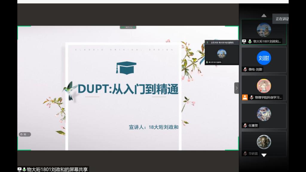 首先,刘政和以自己参赛的PPT为例,为大家讲解如何做好一道题,为参赛选手提供参加比赛的思路与建议。接着,毕研晨从国赛的角度为大家讲述自己参加比赛的一些心得,重点介绍如何查找文献、阅读文献并得到自己想要的内容。最后,李世济为参赛队员讲解DUPT的赛制流程以及向同学们介绍如何组队,并且在科研软件方面还进行一些推荐。